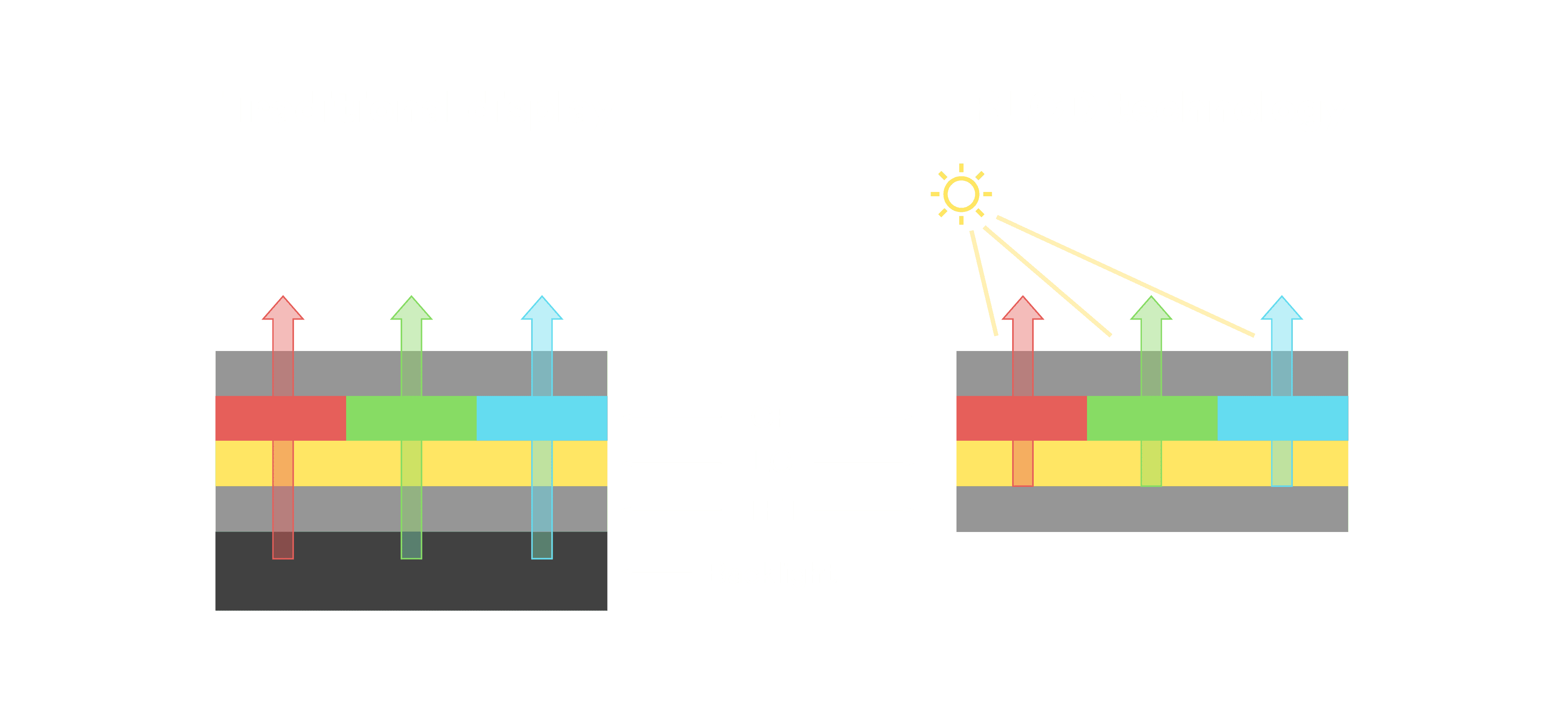 与传统需搭配背光单元的液晶显示相比,,反射式液晶技术不仅更省电、、、、更轻薄,,,且即便在艳阳下仍能清晰显示。。。。此外,,少了背光单元,,也大幅降低了 LED 蓝光伤害眼睛的疑虑。。